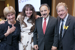 Pictured from left – event honoree Mary Otto, CHA Foundation President and Cambridge Health Alliance Chief Community Officer Mary Cassesso, Cambridge Health Alliance Interim CEO Assaad Sayah, MD, and comedian Jimmy Tingle at CHA’s Art of Healing Award Dinner at the Charles Hotel in Cambridge on June 13. Photo courtesy of Jeff Thiebauth.more